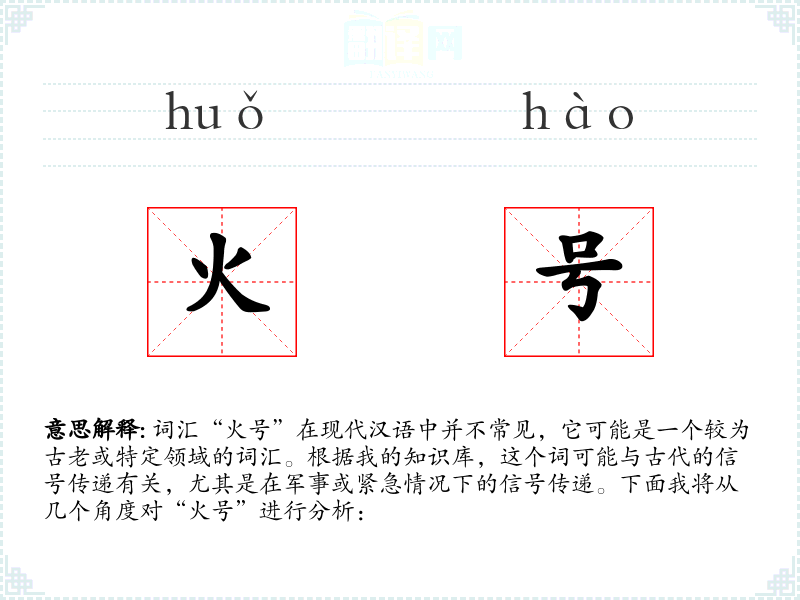 - 反义词:无(由于“火号”是一个特定且不太常用的词汇,反义词可能不适用)