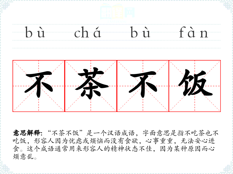 “不茶不饭”是一个汉语成语,字面意思是指不吃茶也不吃饭,形容人因为忧虑或烦恼而没有食欲,心事重重,无法安心进食。这个成语通常用来形容人的精神状态不佳,因为某种原因而心烦意乱。