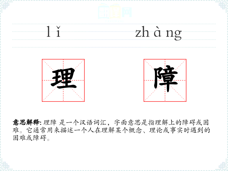 理障 这个词由“理”和“障”两个字组成。“理”指道理、理解,“障”指障碍。这个词在现代汉语中较为常见,主要用于描述认知上的困难。
