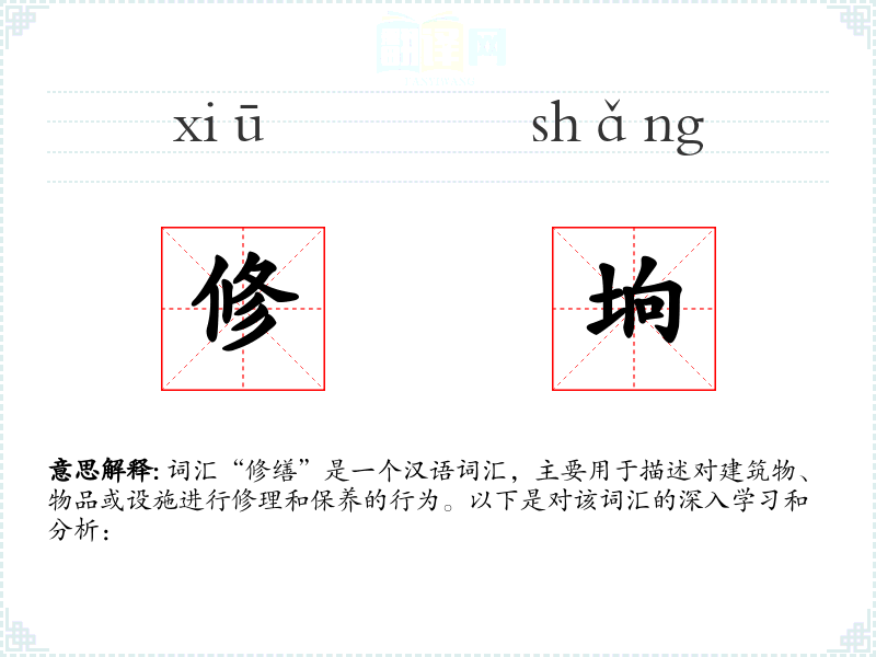 - 词源:修缮的词源可以追溯到古代汉语,其中“修”和“缮”都有悠久的历史。