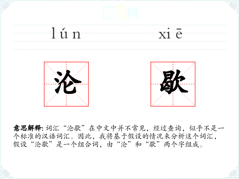 词汇“沦歇”在中文中并不常见,经过查询,似乎不是一个标准的汉语词汇。因此,我将基于假设的情况来分析这个词汇,假设“沦歇”是一个组合词,由“沦”和“歇”两个字组成。