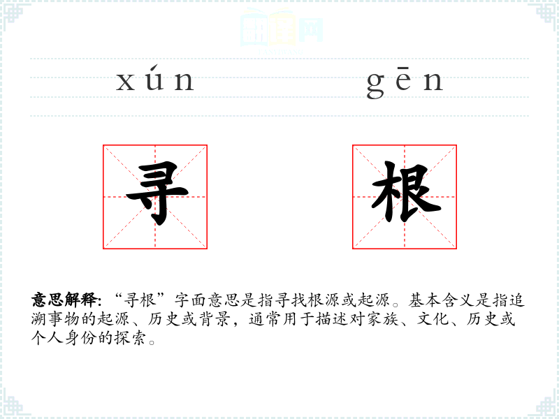 “寻根”字面意思是指寻找根源或起源。基本含义是指追溯事物的起源、历史或背景,通常用于描述对家族、文化、历史或个人身份的探索。