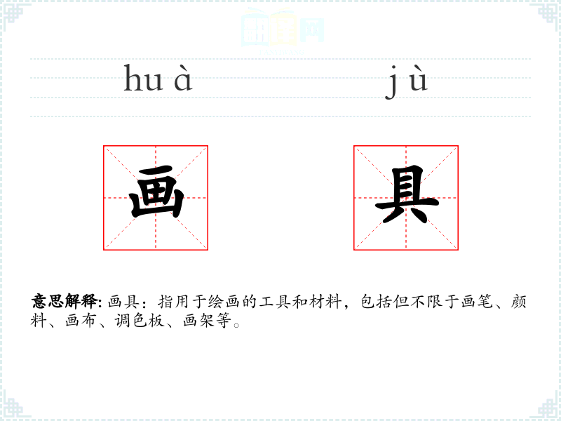 - 词源:“画具”一词由“画”和“具”组成,其中“画”指绘画,“具”指工具或器具。