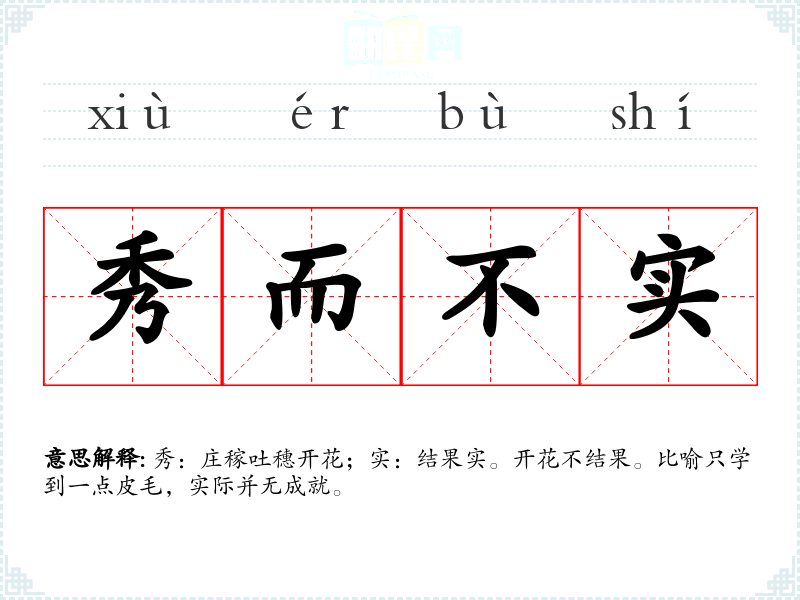 秀:庄稼吐穗开花;实:结果实。开花不结果。比喻只学到一点皮毛,实际并无成就。