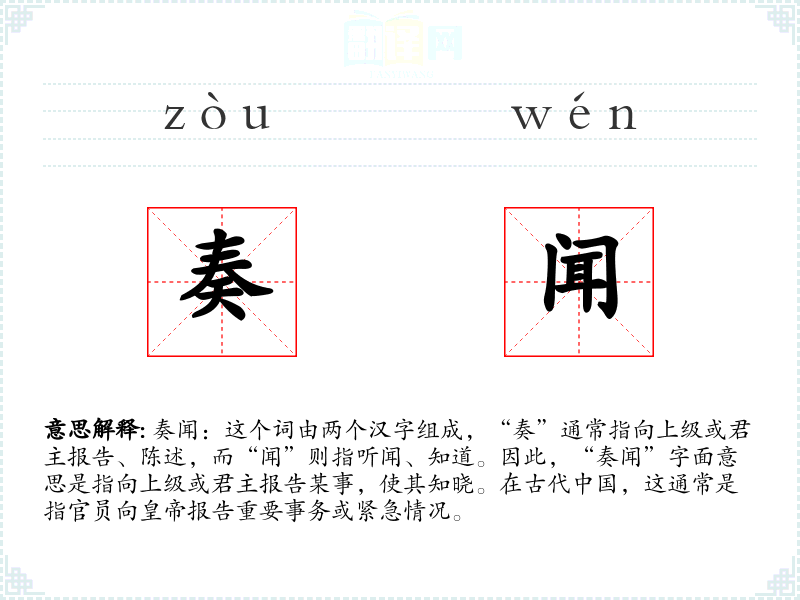 奏闻:这个词由两个汉字组成,“奏”通常指向上级或君主报告、陈述,而“闻”则指听闻、知道。因此,“奏闻”字面意思是指向上级或君主报告某事,使其知晓。在古代,这通常是指官员向报告重要事务或紧急情况。
