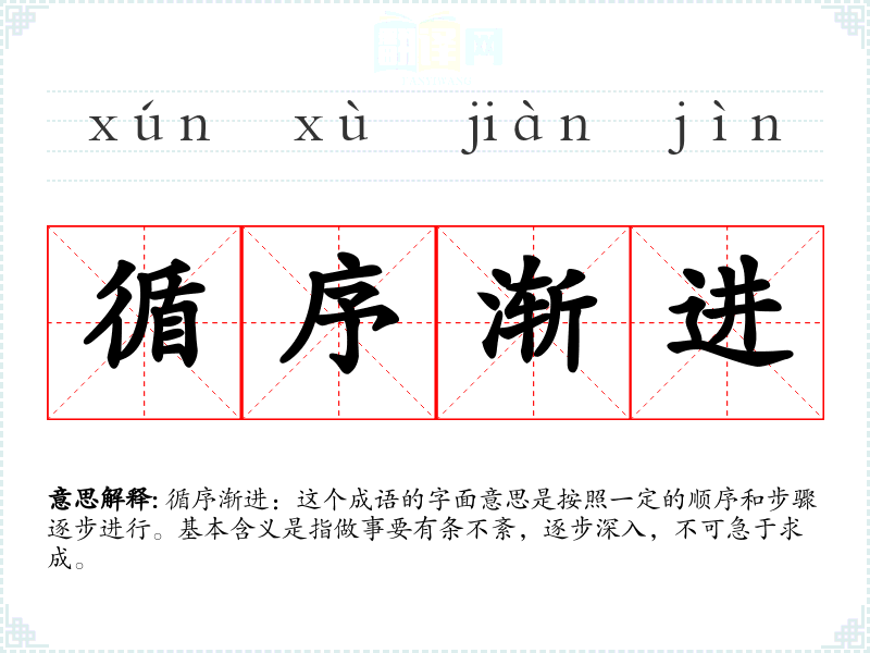 循序渐进:这个成语的字面意思是按照一定的顺序和步骤逐步进行。基本含义是指做事要有条不紊,逐步深入,不可急于求成。