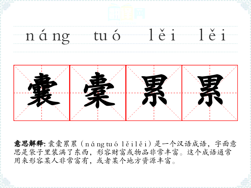 囊橐累累(náng tuó lěi lěi)是一个汉语成语,字面意思是袋子里装满了东西,形容财富或物品非常丰富。这个成语通常用来形容某人非常富有,或者某个地方资源丰富。
