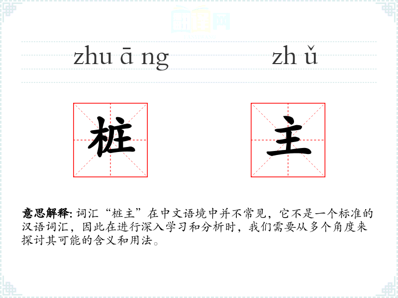 “桩主”这个词汇虽然在汉语中不常见,但它可能在特定领域和语境中具有特定的含义和用途。在语言学习和表达中,了解这样的词汇可以帮助我们更全面地理解语言的多样性和专业性。