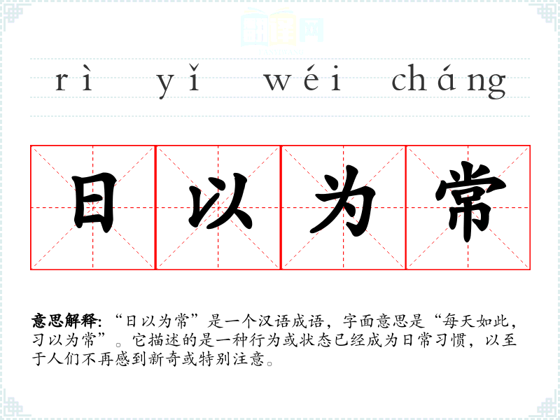 “日以为常”是一个汉语成语,字面意思是“每天如此,以为常”。它描述的是一种行为或状态已经成为日常惯,以至于人们不再感到新奇或特别注意。