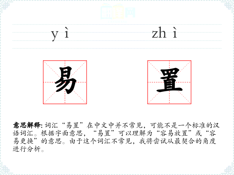 词汇“易置”在中文中并不常见,可能不是一个标准的汉语词汇。根据字面意思,“易置”可以理解为“容易放置”或“容易更换”的意思。由于这个词汇不常见,我将尝试从最契合的角度进行分析。