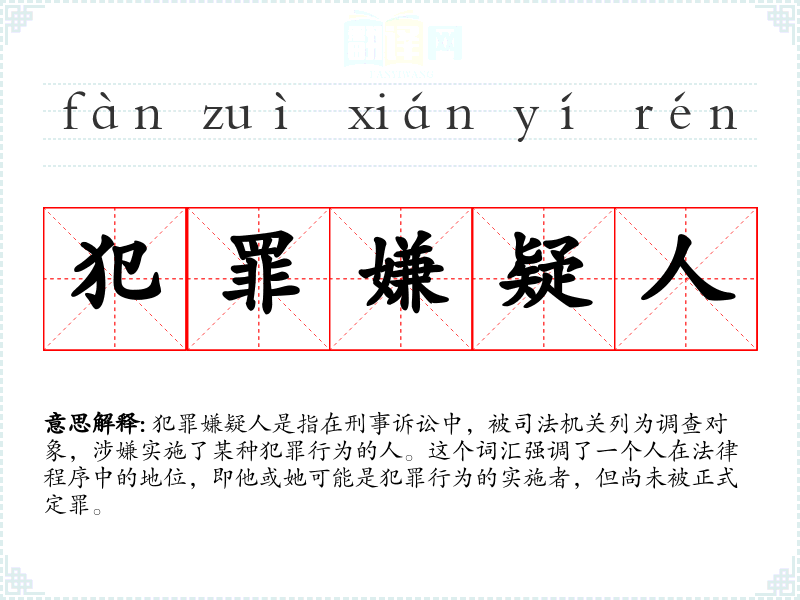 在不同的语言和文化中,“犯罪嫌疑人”的对应词汇可能有所不同,但其核心含义——即涉嫌犯罪但尚未定罪的人——是普遍存在的。例如,在英语中,对应的词汇是“suspect”。