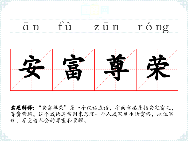 “安富尊荣”是一个汉语成语,字面意思是指安定富足,尊贵荣耀。这个成语通常用来形容一个人或家庭生活富裕,地位显赫,享受着社会的尊重和荣耀。