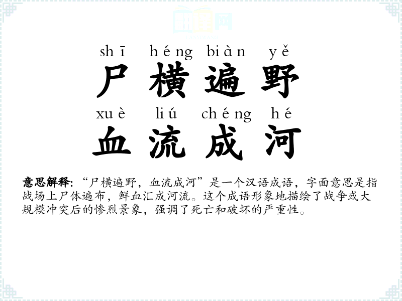 - 文学:在文学作品中,这个成语常用来描述战争的残酷和惨烈,如历史小说、战争题材的作品。