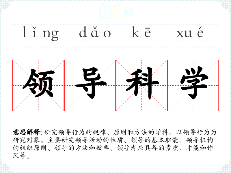 研究领导行为的规律、原则和方法的学科。以领导行为为研究对象。主要研究领导活动的性质、领导的基本职能、领导机构的组织原则、领导的方法和效率、领导者应具备的素质、才能和作风等。