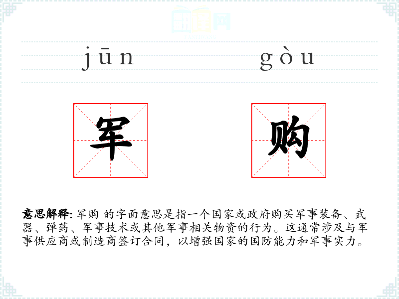 “军购”一词由“军”和“购”两个字组成。在古代汉语中,“军”指军队,“购”指购买。随着现代军事技术的发展和国际关系的变化,军购的概念和实践也在不断演变。