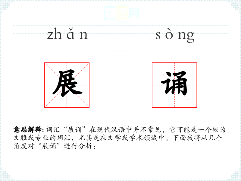 词汇“展诵”在现代汉语中并不常见,它可能是一个较为文雅或专业的词汇,尤其是在文学或学术领域中。下面我将从几个角度对“展诵”进行分析: