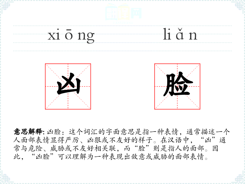 凶脸:这个词汇的字面意思是指一种表情,通常描述一个人面部表情显得严厉、凶狠或不友好的样子。在汉语中,“凶”通常与危险、威胁或不友好相关联,而“脸”则是指人的面部。因此,“凶脸”可以理解为一种表现出敌意或威胁的面部表情。