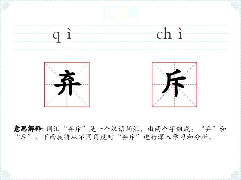 “弃”字最早见于甲骨文,原意为抛弃;“斥”字原意为排斥、拒绝。两个字组合在一起,形成了“弃斥”这个词汇,其含义在历史演变中保持相对稳定。