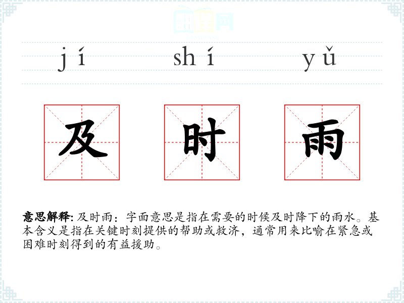 及时雨:字面意思是指在需要的时候及时降下的雨水。基本含义是指在关键时刻提供的帮助或救济,通常用来比喻在紧急或困难时刻得到的有益援助。