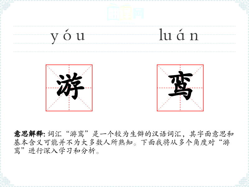 词汇“游鸾”是一个较为生僻的汉语词汇,其字面意思和基本含义可能并不为大多数人所熟知。下面我将从多个角度对“游鸾”进行深入学*和分析。