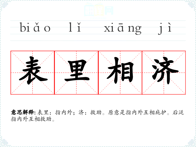 表里:指内外;济:救助。原意是指内外互相庇护。后泛指内外互相救助。