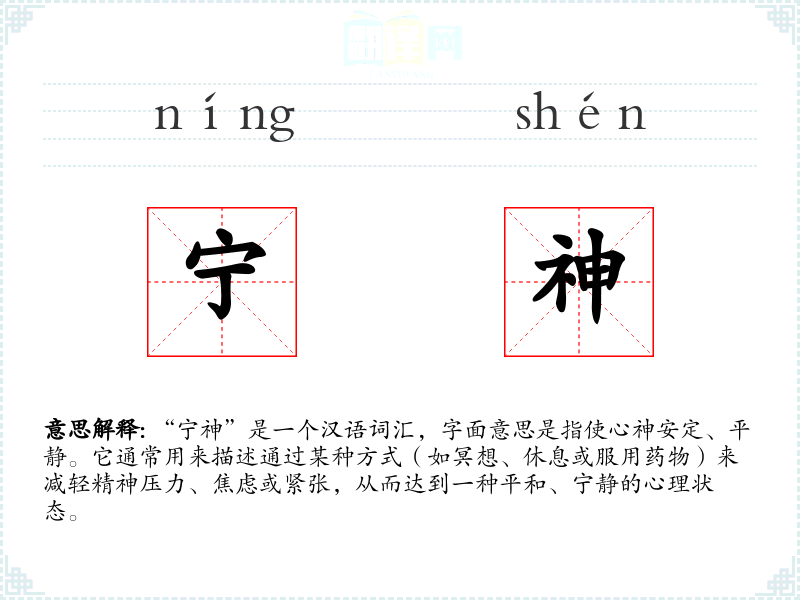 “宁神”是一个汉语词汇,字面意思是指使心神安定、平静。它通常用来描述通过某种方式(如冥想、休息或服用药物)来减轻精神压力、焦虑或紧张,从而达到一种平和、宁静的心理状态。