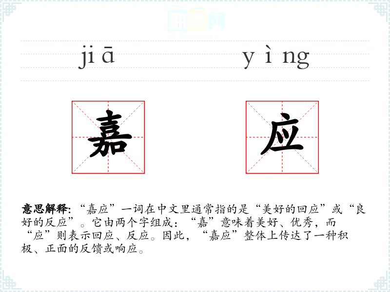 在英语中,“嘉应”可以对应为“positive response”或“favorable reaction”,虽然表达方式不同,但传达的正面意义是相似的。