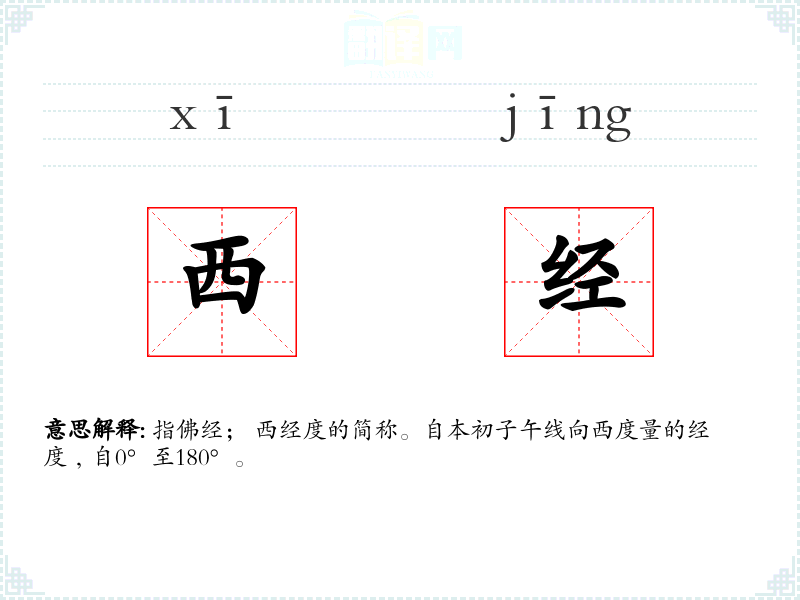 指佛经; 西经度的简称。自本初子午线向西度量的经度﹐自0°至180°。