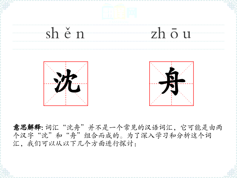 词汇“沈舟”并不是一个常见的汉语词汇,它可能是由两个汉字“沈”和“舟”组合而成的。为了深入学*和分析这个词汇,我们可以从以下几个方面进行探讨:
