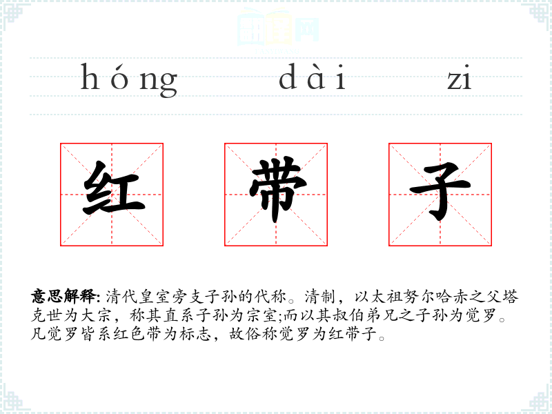 清代皇室旁支子孙的代称。清制,以太祖努尔哈赤之父塔克世为大宗,称其直系子孙为宗室;而以其叔伯弟兄之子孙为觉罗。凡觉罗皆系红色带为标志,故俗称觉罗为红带子。