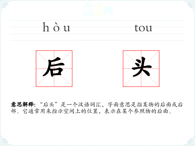 “后头”是一个汉语词汇,字面意思是指某物的后面或后部。它通常用来指示空间上的位置,表示在某个参照物的后面。