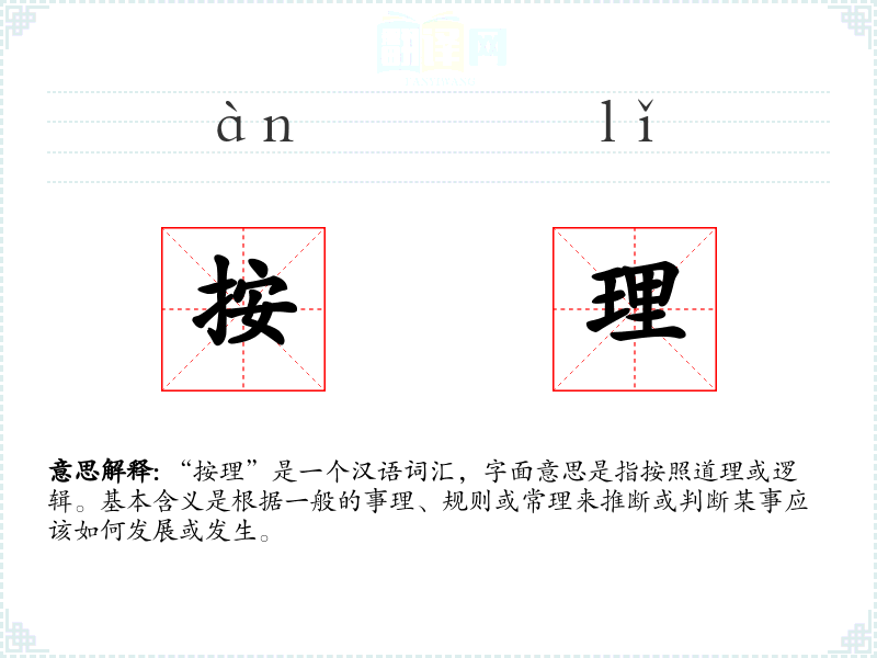 “按理”是一个汉语词汇,字面意思是指按照道理或逻辑。基本含义是根据一般的事理、规则或常理来推断或判断某事应该如何发展或发生。