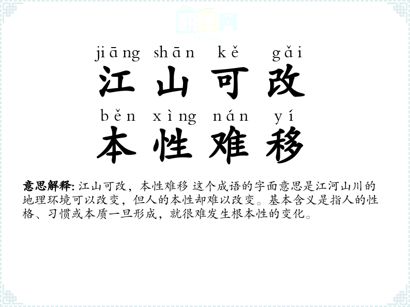 江山可改,本性难移 这个成语的字面意思是江河山川的地理环境可以改变,但人的本性却难以改变。基本含义是指人的性格、*惯或本质一旦形成,就很难发生根本性的变化。