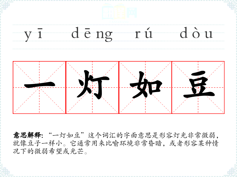 “一灯如豆”这个词汇的字面意思是形容灯光非常微弱,就像豆子一样小。它通常用来比喻环境非常昏暗,或者形容某种情况下的微弱希望或光芒。