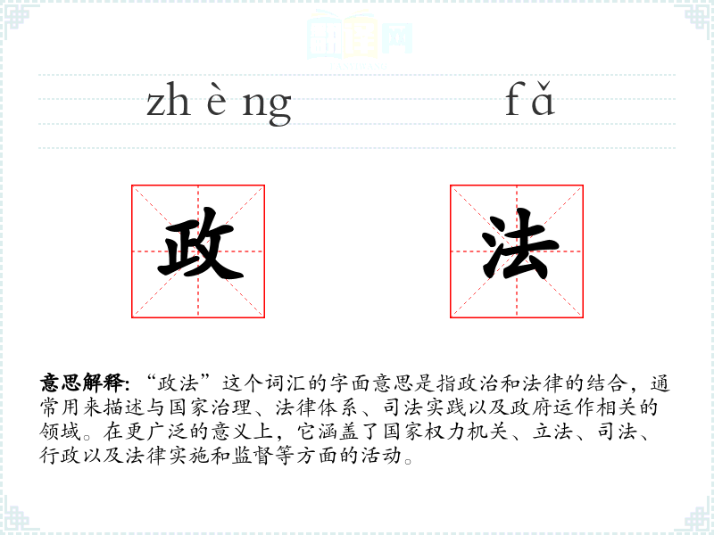 “政法”这个词汇的字面意思是指政治和法律的结合,通常用来描述与国家治理、法律体系、司法实践以及政府运作相关的领域。在更广泛的意义上,它涵盖了国家权力机关、立法、司法、行政以及法律实施和监督等方面的活动。