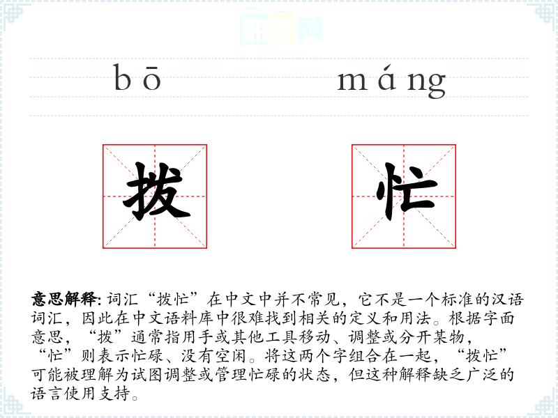 词源与演变: 由于“拨忙”不是一个标准词汇,它的词源和历史演变无从谈起。
