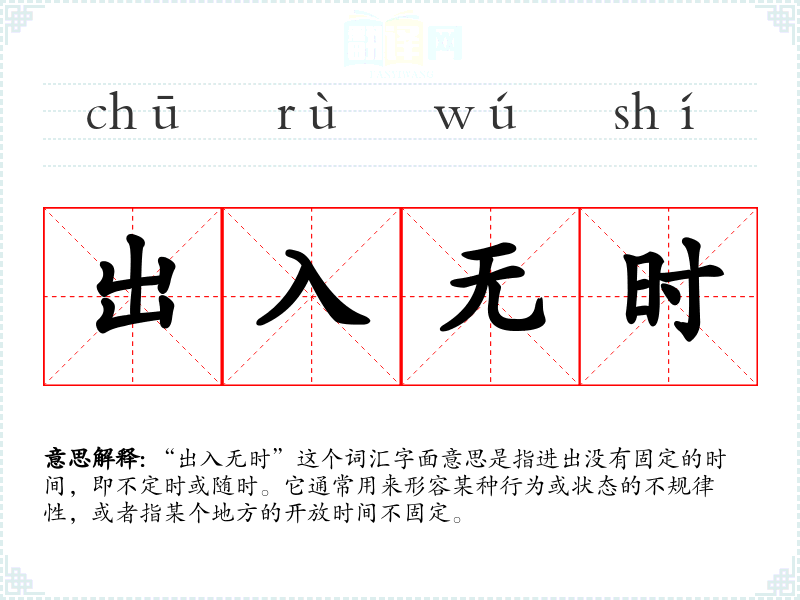 “出入无时”这个词汇字面意思是指进出没有固定的时间,即不定时或随时。它通常用来形容某种行为或状态的不规律性,或者指某个地方的开放时间不固定。