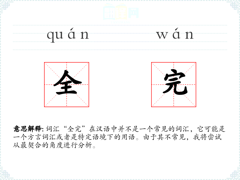 词汇“全完”在汉语中并不是一个常见的词汇,它可能是一个方言词汇或者是特定语境下的用语。由于其不常见,我将尝试从最契合的角度进行分析。