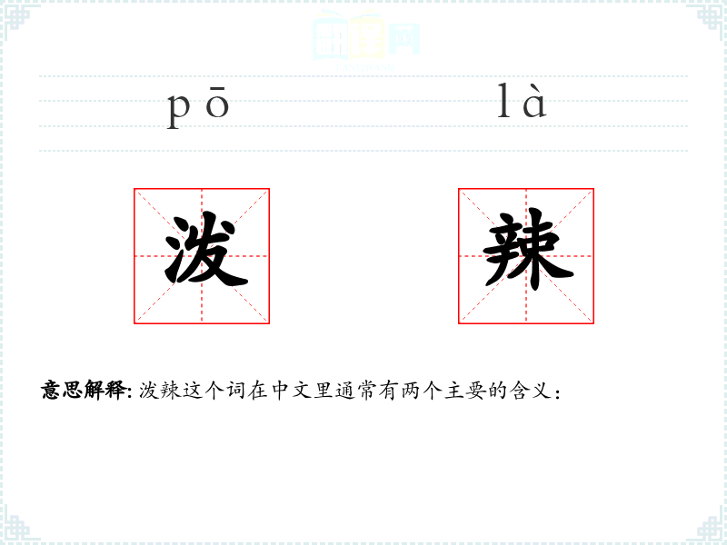 在英语中,“泼辣”可以对应为“spicy”(形容食物)或“bold”(形容人)。在不同的文化中,这个词的接受度和使用情况可能有所不同。