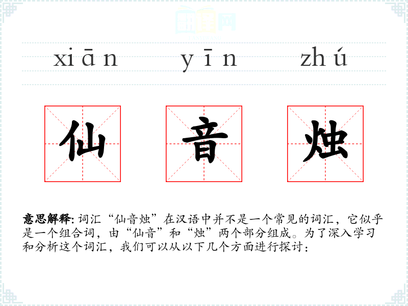 词汇“仙音烛”在汉语中并不是一个常见的词汇,它似乎是一个组合词,由“仙音”和“烛”两个部分组成。为了深入学*和分析这个词汇,我们可以从以下几个方面进行探讨: