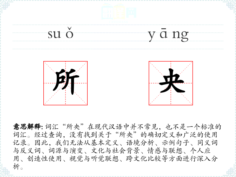 由于“所央”不是一个已知的词汇,我们无法提供上述各个方面的详细分析。如果您有其他词汇或主题需要分析,请提供具体信息,我们将很乐意帮助您进行深入学习和分析。