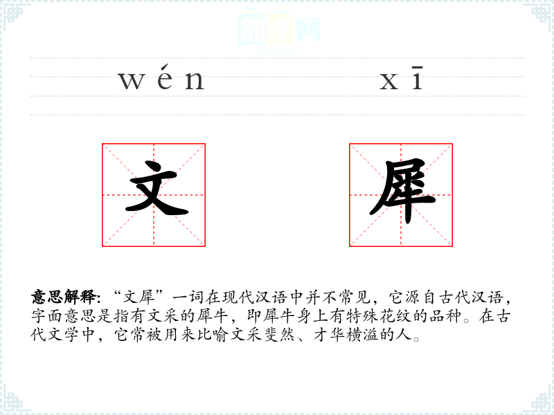 “文犀”一词在现代汉语中并不常见,它源自古代汉语,字面意思是指有文采的犀牛,即犀牛身上有特殊花纹的品种。在古代文学中,它常被用来比喻文采斐然、才华横溢的人。