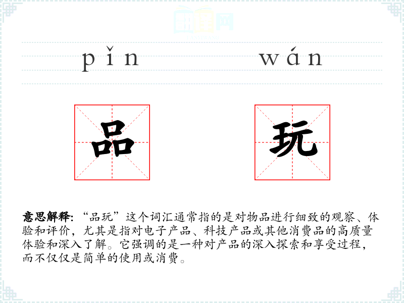 “品玩”这个词汇通常指的是对物品进行细致的观察、体验和评价,尤其是指对电子产品、科技产品或其他消费品的高质量体验和深入了解。它强调的是一种对产品的深入探索和享受过程,而不仅仅是简单的使用或消费。