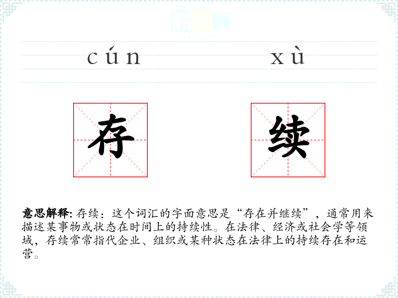 存续:这个词汇的字面意思是“存在并继续”,通常用来描述某事物或状态在时间上的持续性。在法律、经济或社会学等领域,存续常常指代企业、组织或某种状态在法律上的持续存在和运营。