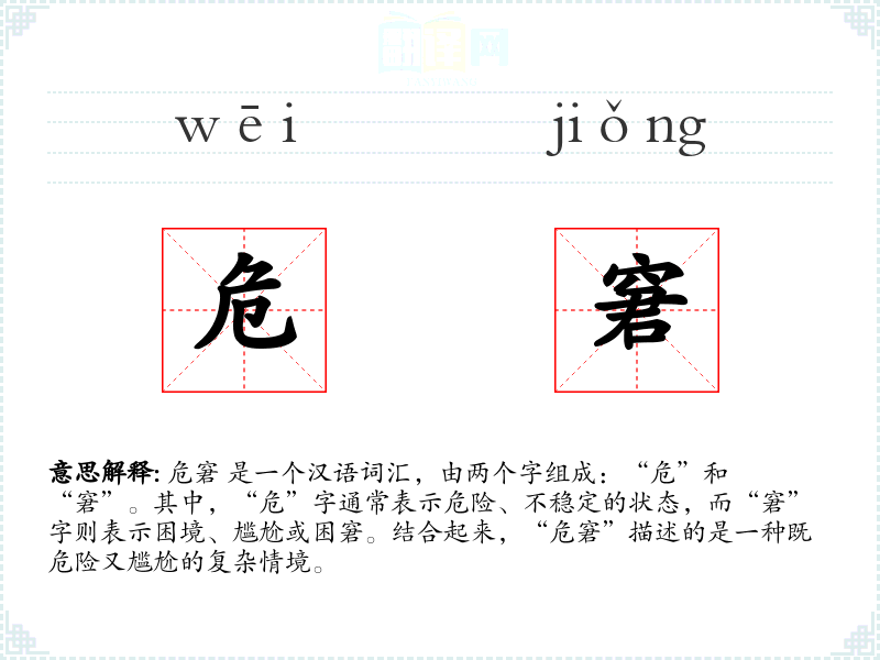 - 文学:在文学作品中,“危窘”常用来形容人物在关键时刻的困境,如《红楼梦》中贾宝玉在家族衰败时的处境。