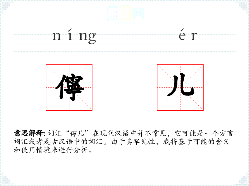 词汇“儜儿”在现代汉语中并不常见,它可能是一个方言词汇或者是古汉语中的词汇。由于其罕见性,我将基于可能的含义和使用情境来进行分析。