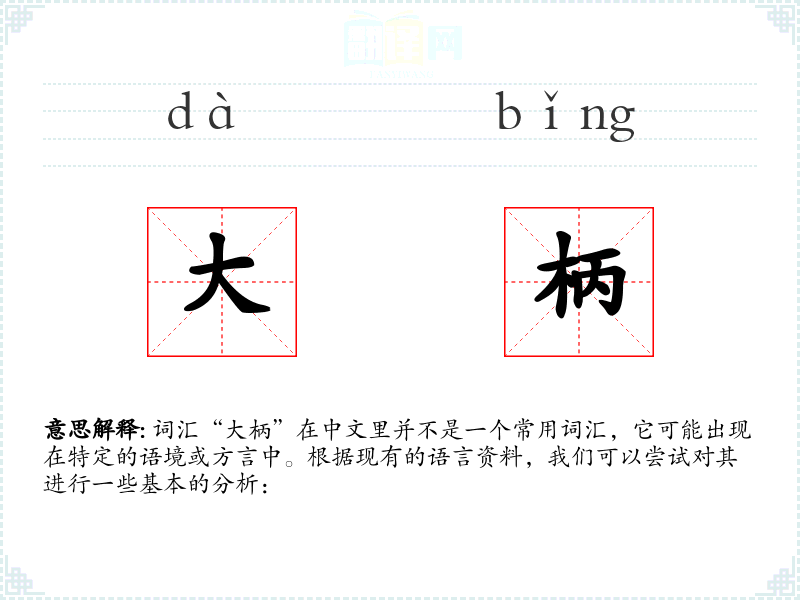 词汇“大柄”在中文里并不是一个常用词汇,它可能出现在特定的语境或方言中。根据现有的语言资料,我们可以尝试对其进行一些基本的分析: