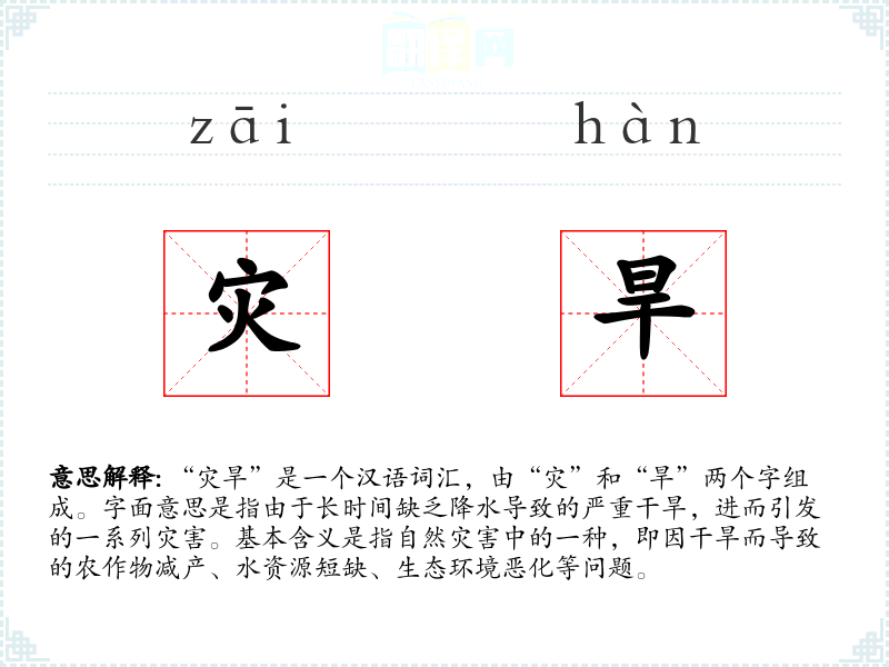“灾旱”一词的词源较为直接,由“灾”和“旱”两个常用字组成。在古代文献中已有使用,如《史记》中提到的“灾旱”,随着时间的推移,其含义和用法基本保持稳定。