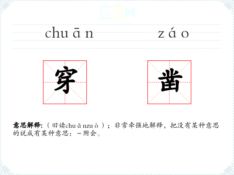 (旧读chuānzuò);非常牵强地解释,把没有某种意思的说成有某种意思:~附会。