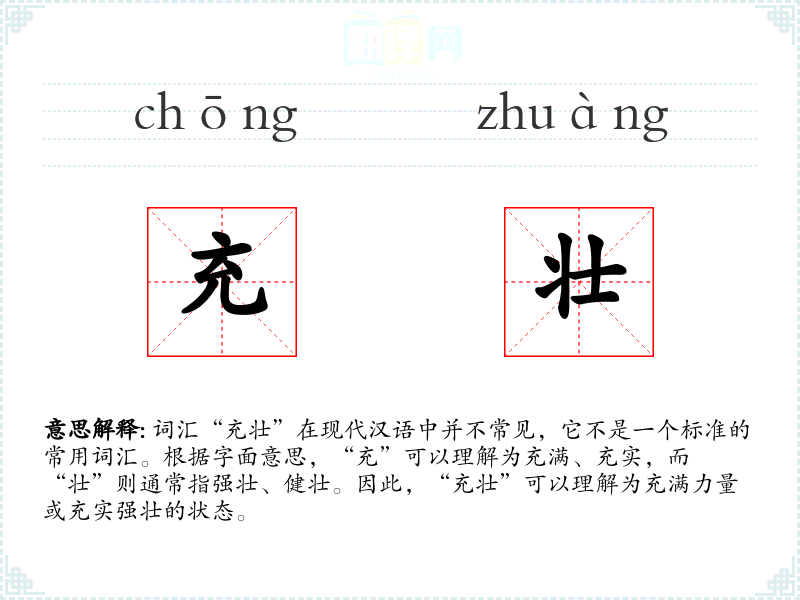 词汇“充壮”在现代汉语中并不常见,它不是一个标准的常用词汇。根据字面意思,“充”可以理解为充满、充实,而“壮”则通常指强壮、健壮。因此,“充壮”可以理解为充满力量或充实强壮的状态。